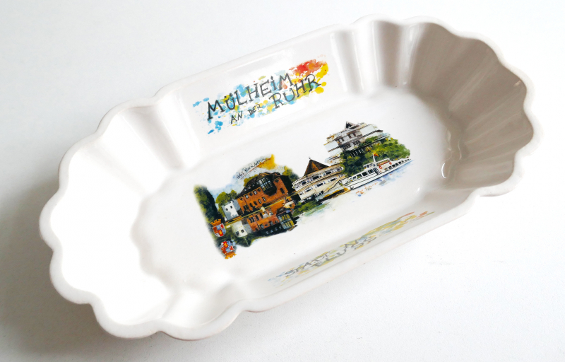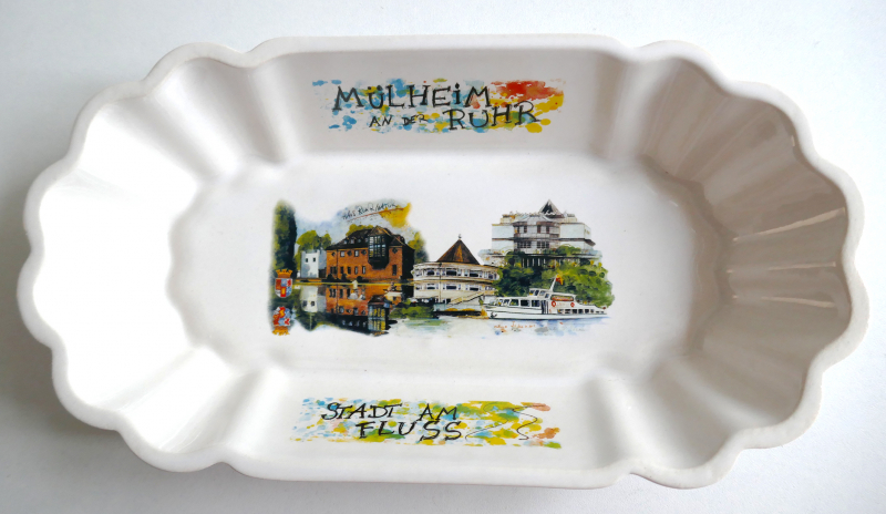 Eine Pommesschale aus Keramik mit dem Dekor Mülheimer Wasserbahnhof und Haus Ruhrnatur