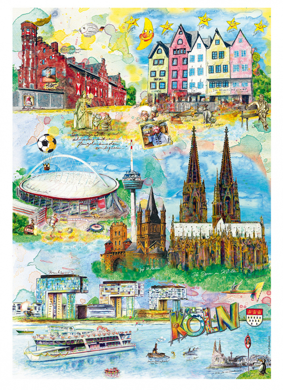Der Künstler nimmt mit auf eine humorvolle Augenreise zu den schönsten und markantesten Orten in der Rhein-Metropole: Vom romantischen Martinswinkel mit dem Denkmal von Willy Millowitsch, dem Stadtmuseum, Details aus dem Heinzelmännchen-Brunnen, über die Köln-Arena und die Kranhäuser, dem Fernsehturm Colonius, zum Kölner Dom an den Rhein mit dem modernen Touristenschiff RheinFantasie.