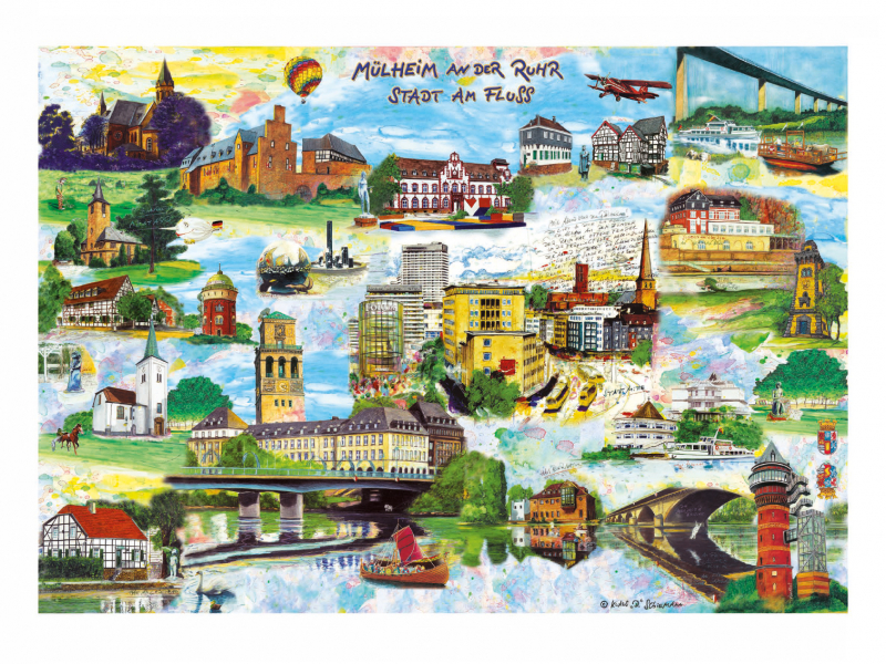 Das Panorama-Bild nun auch im kleineren Format von 40 x 30 cm. Auf diesem Motiv finden sich ganz viele schöne Details der Stadt am Fluss gezeichnet von dem Mülheimer Künstler Klaus D. Schiemann.